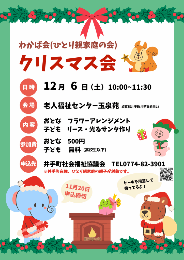 2025.11.14 お知らせ 毎年恒例、「わかば会」クリスマス会を開催します!お申し込みはこちらから! 「わかば会」はひとり親家庭の会で、随時会員を募集しています。会員登録は無料です。 年に2~3回イベントを開催し、交流していますので、ぜひお気軽にご参加ください! お問い合わせは、井手町社会福祉協議会 TEL0774-82-3901まで。